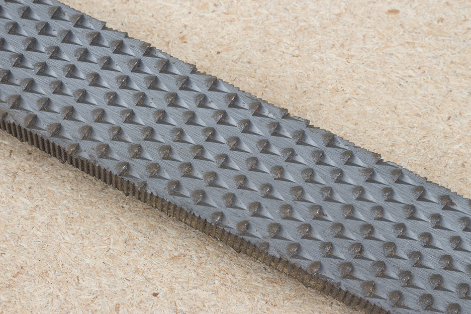 Detalhe da dentição (picado) de uma lima. Este formato é adequado para desbaste de metais, mas também é uma ótima ferramenta para acabamento em madeira.